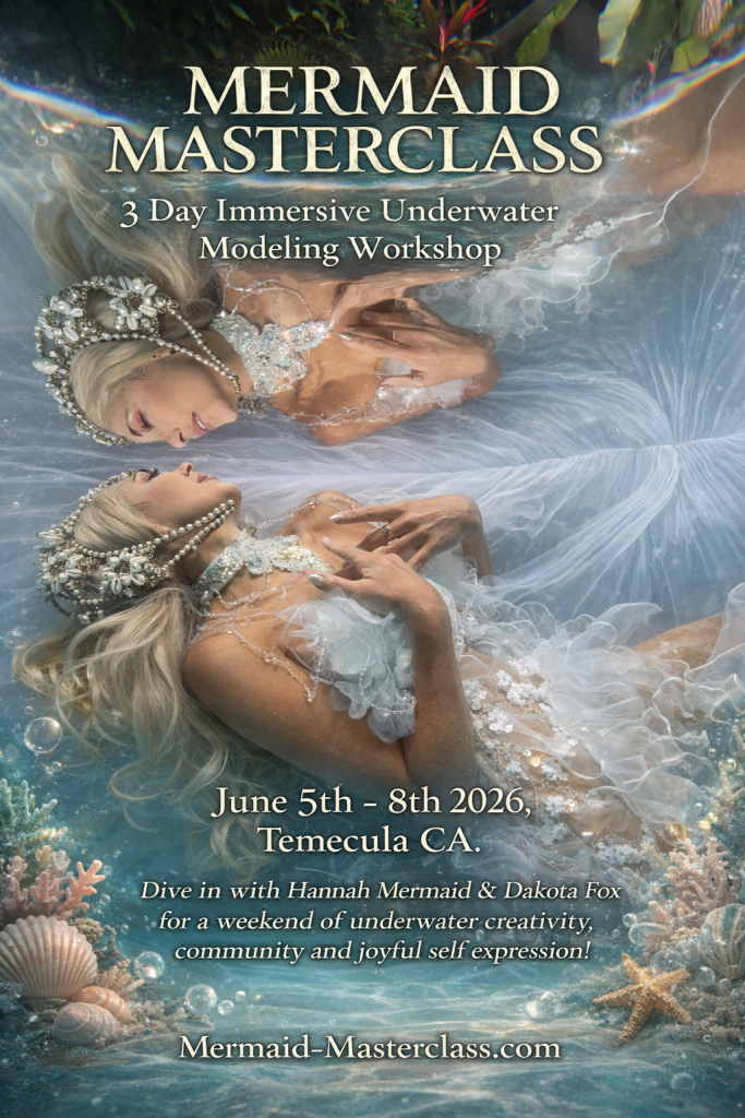A rare chance to dive into the world of underwater modeling with Hannah Mermaid – an intimate 3-day masterclass blending artistry, movement, and magic, set at a stunning private estate in Temecula wine country!