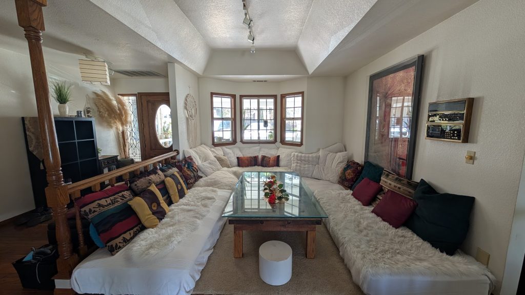 Inside, the space feels like a luxury slumber party – a sunken white-carpeted living room, a spacious home to relax and connect, and nourishing vegetarian meals included throughout your stay.