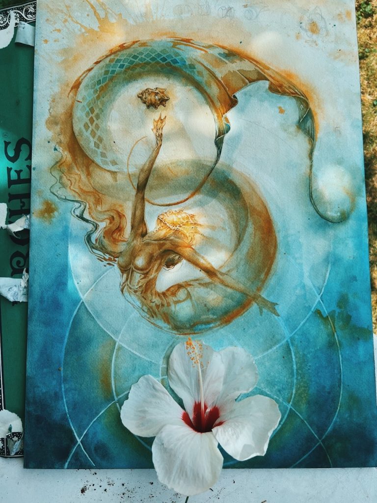 Instead of forcing the outcome, you learn to soften and follow, allowing the brush to guide you. Like moving underwater, it becomes a practice of surrender – trusting the flow and letting something unexpectedly beautiful emerge.